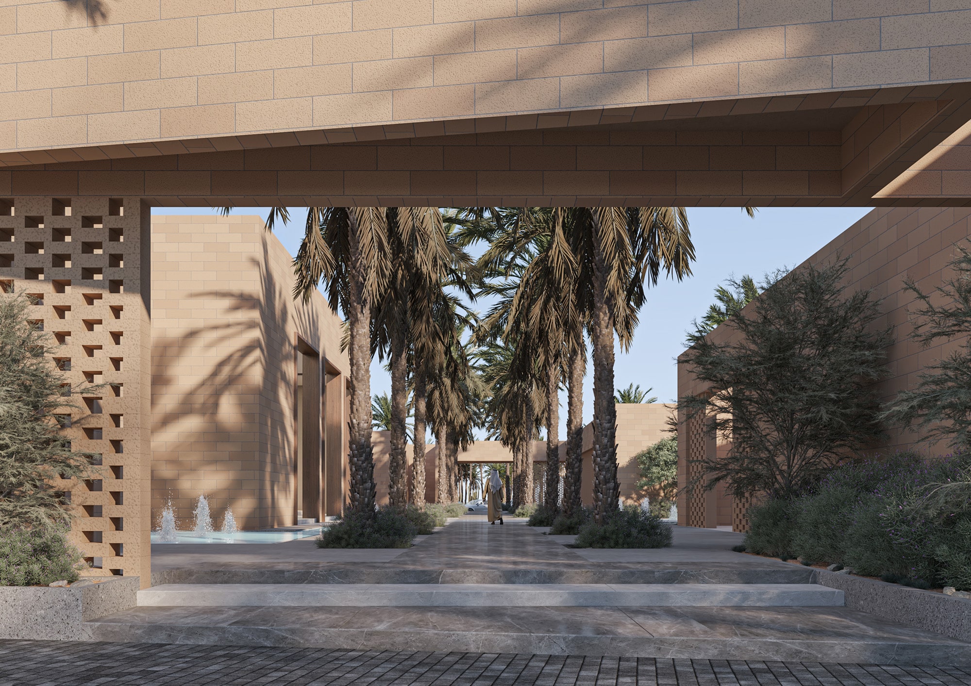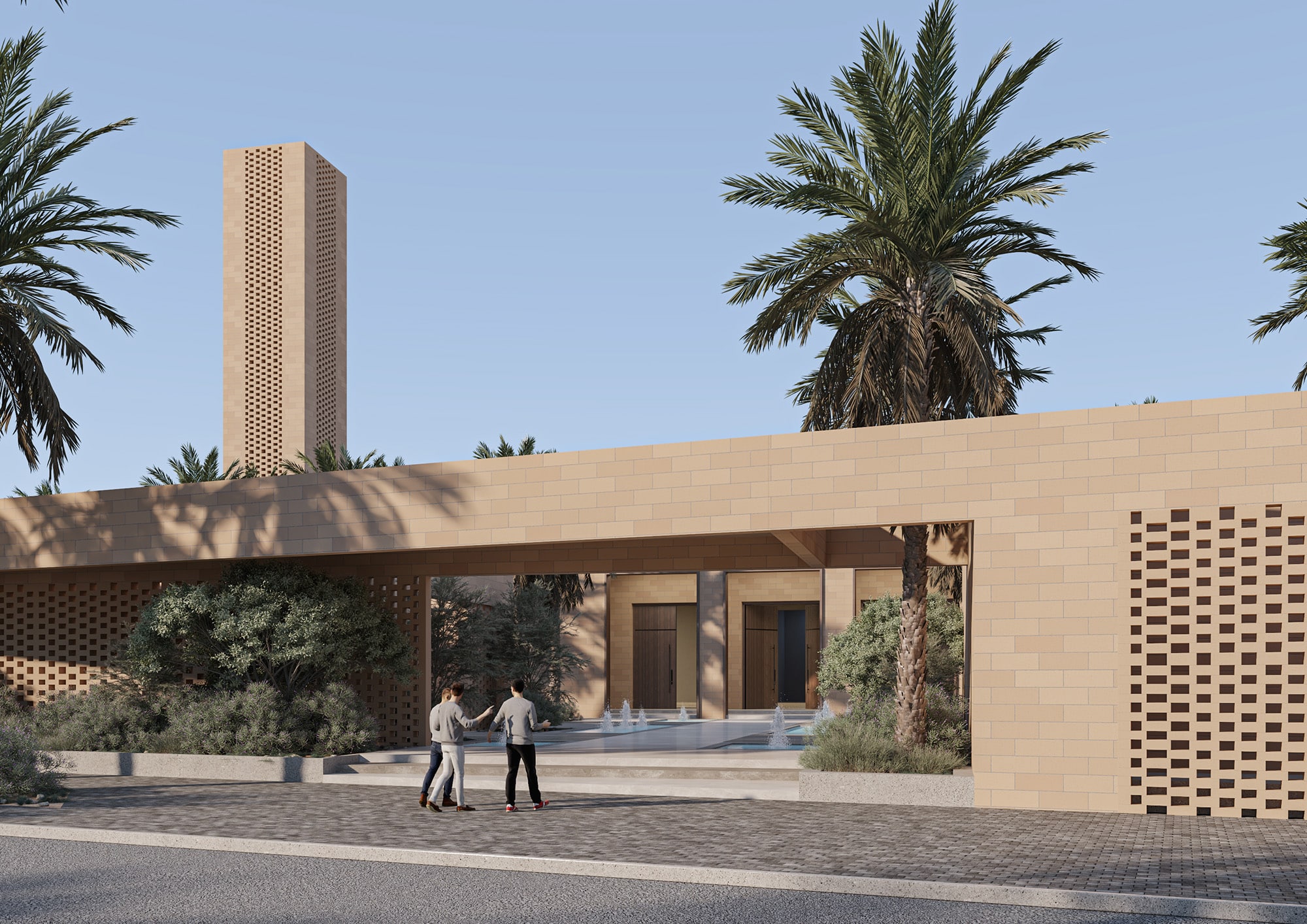 The design emphasizes privacy for worshippers through thoughtfully designed openings and façades inspired by traditional Islamic patterns, allowing natural light to enter while preserving the sanctity of the interior spaces. Local architectural elements and materials suited to the climate and environment are incorporated to reinforce cultural identity.